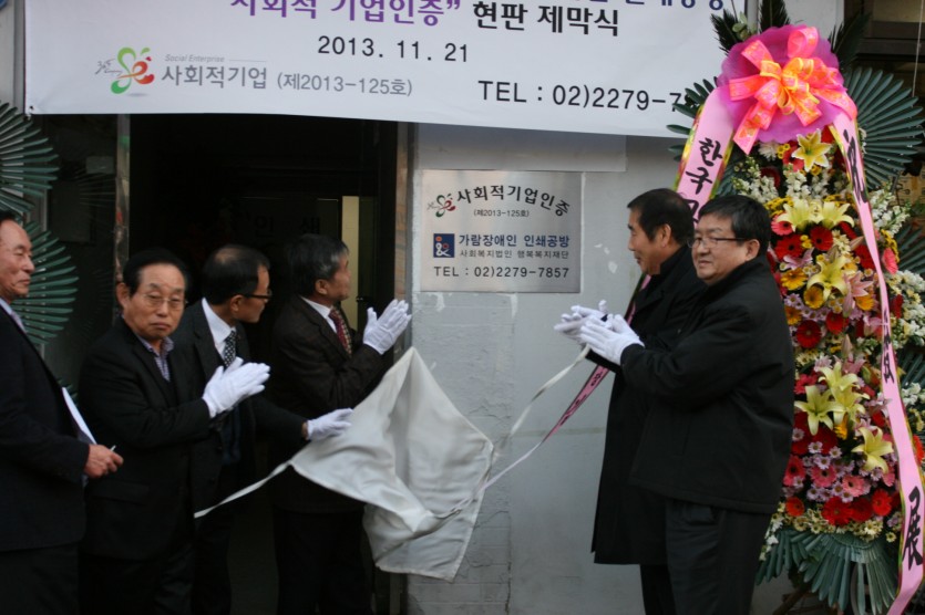 사회적기업 현판제막식 최고관리자 0 1551 2014.01.14 16:58 우리법인에서 취약계층의 일자리창출에 기여하고 지역사회복지증진을 위하여 설치한 중증장애인시설인 가람장애인인쇄공방이 지난 9월9일 사회적기업으로 고용노동부로 부터 인증받아 현판 제막식을 하였습니다.참석해 자리를 빛내주신장애인고용공단 채정환 서울지사장님슈마니스(사회적기업) 이욱희 대표님가람장애인인쇄공방 이태규 후원회장님법인산하 시설장님을 비롯한 모든 내빈 여러분께 감사 인사드립니다.